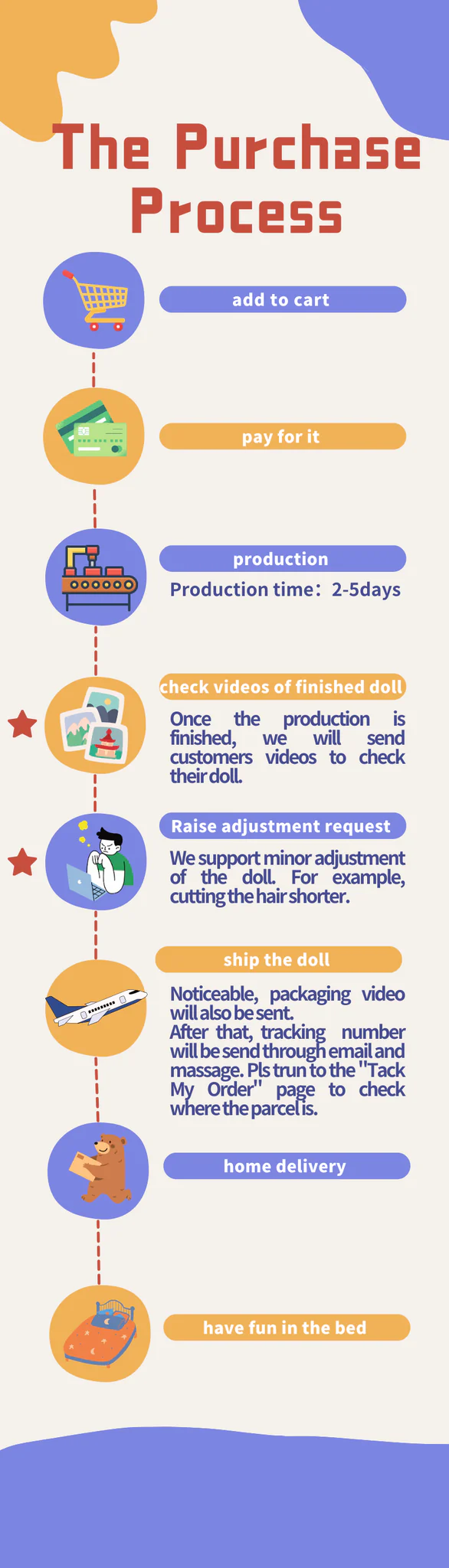 To ease customers’s concern, our website will send customers videos ofthe finished doll after the production and packaging video beforeshipping.